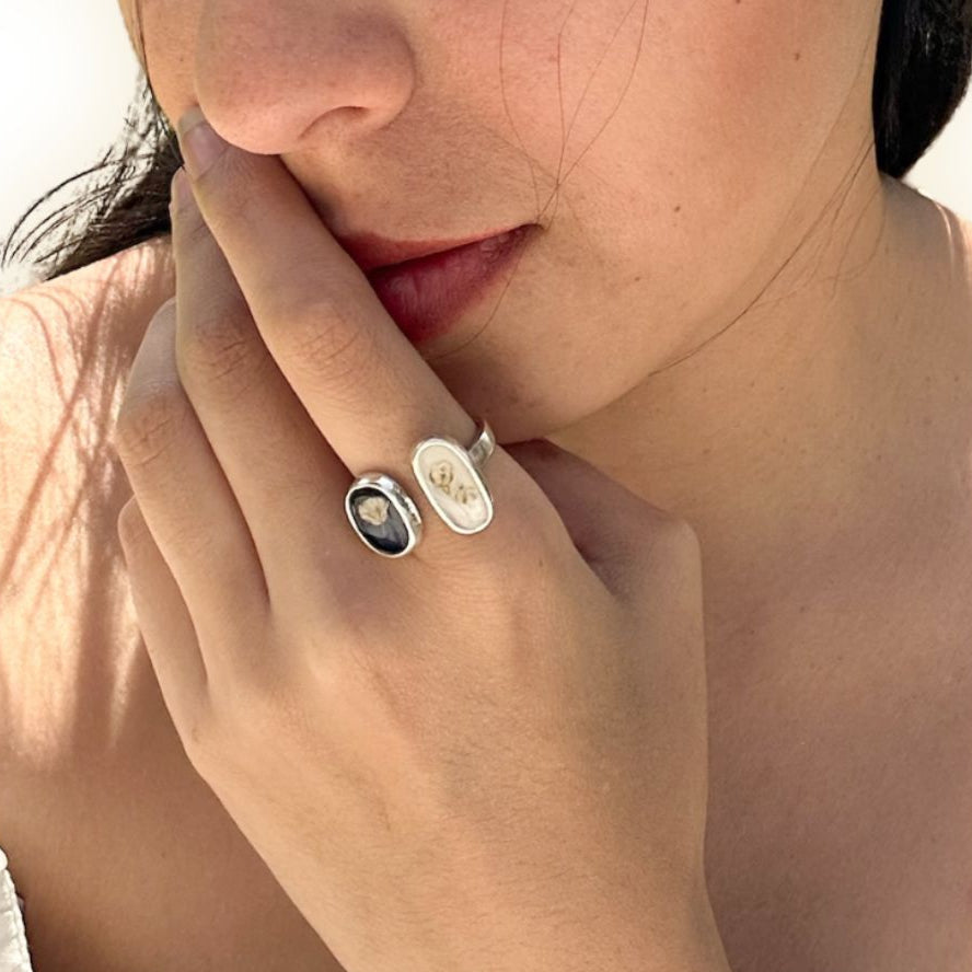 Con formas opuestas que se complementan, este anillo simboliza el equilibrio entre las fuerzas contrastantes de la vida. Perfecto para quienes buscan armonía y conexión entre lo visible y lo invisible, lo tangible y lo etéreo.