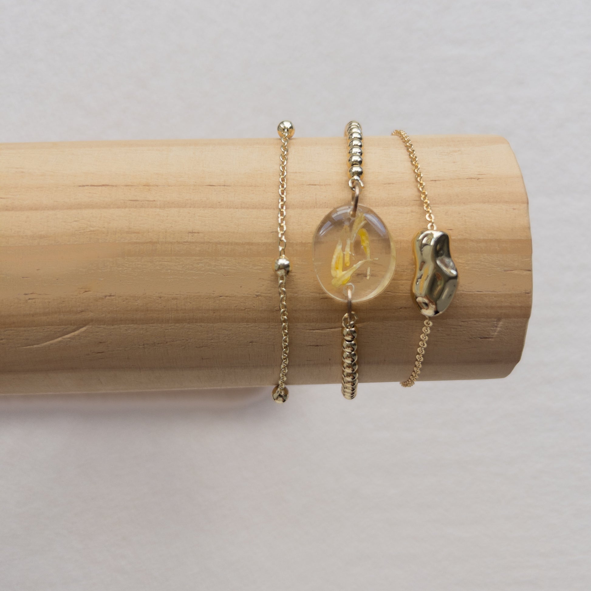 Pulsera con Pétalos de Cholán encapsulados en resina y herrajes acero inoxidable. Pulseras complementarios de acero inoxidable.