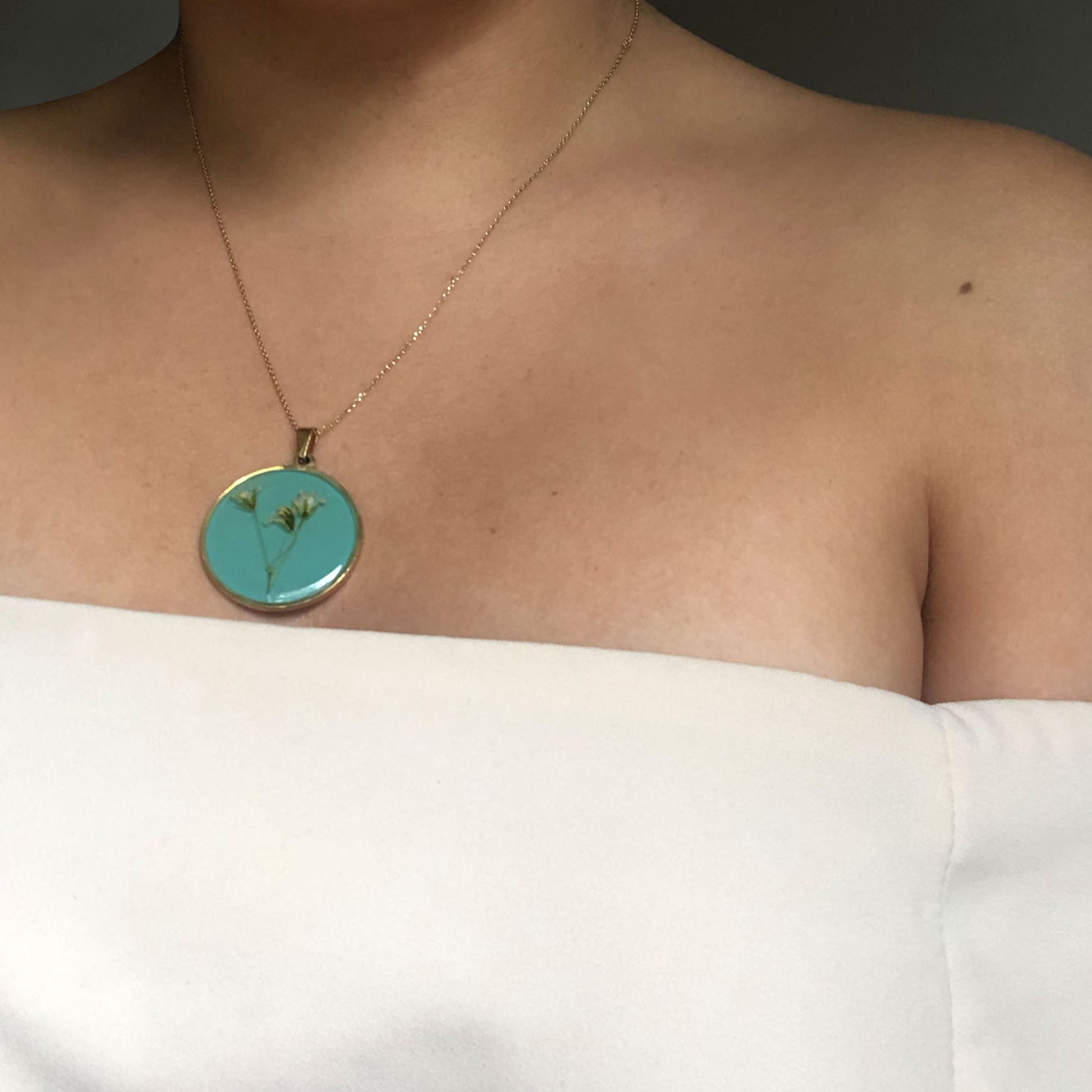 Dije de Flor de Zanahoria Salvaje encapsulados en resina en una base de Acero Inoxidable con baño de oro y colores variados de fondo. Cadena de Acero Inoxidable.