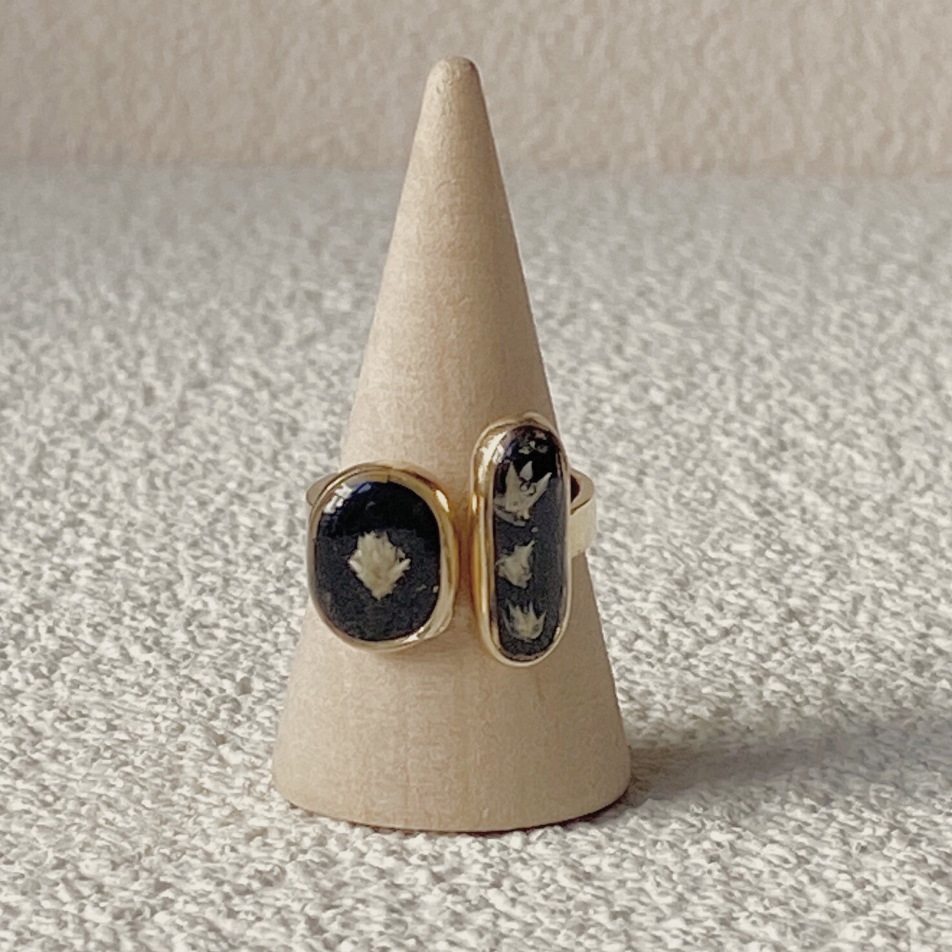 Anillo de Inflorescencias de Pajonal Andino encapsuladas en resina en una base de Plata 925 natural o con baño de oro de 14k y colores variados de fondo. Base fabricada por orfebres en Cuenca, Ecuador.