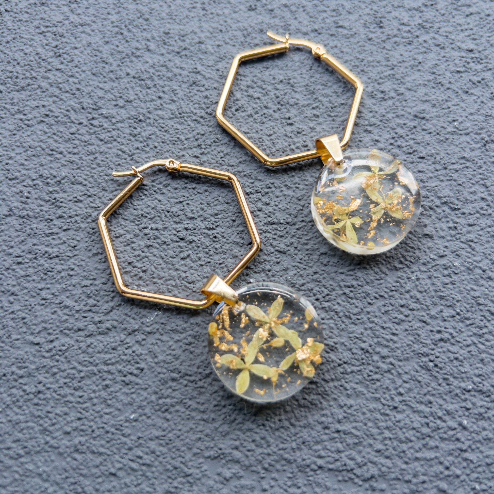 Pétalos de Chorrito de Luz, encapsulados en resina. Argolla y herrajes de acero inoxidable.
