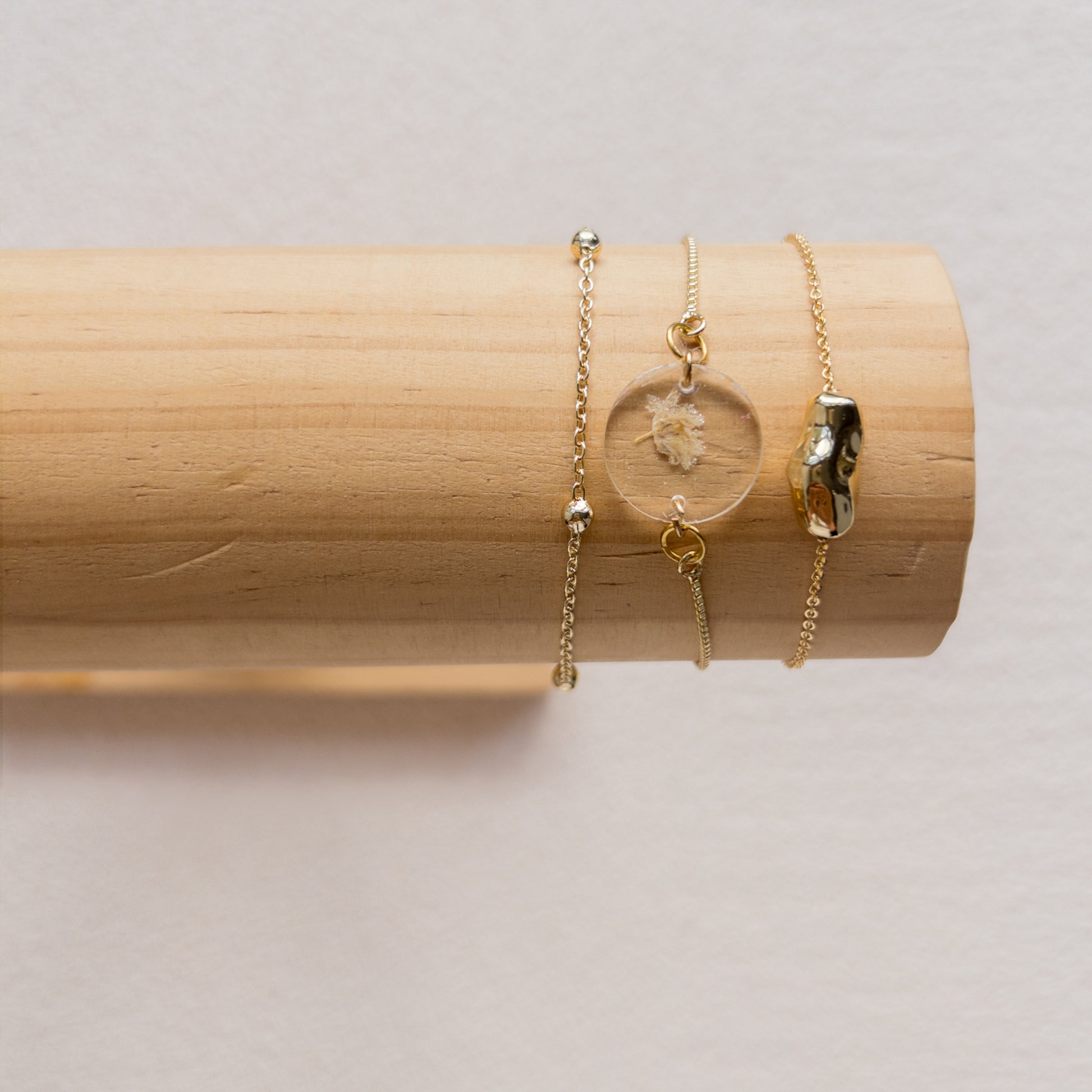 Pulsera con Pétalos de Alelí Blanco encapsulados en resina y herrajes acero inoxidable. Pulseras complementarios de acero inoxidable.